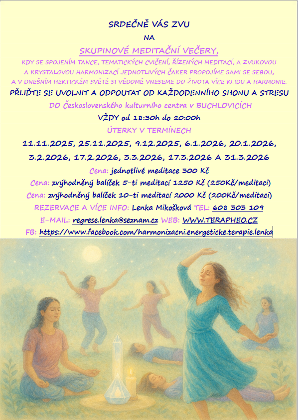 Přijďte se uvolnit a odpoutat od každodenního shonu a stresu ČSKC Buchlovice od 18:30 do 20:00 h 11.11.2025, 25.11.2025, 9.12.2025, 6.1.2026, 20.1.2026, 3.2.2026, 17.2.2026, 3.3.2026,...